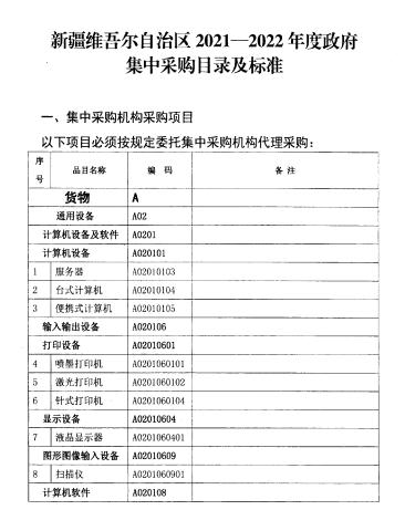新疆維吾爾自治區2021-2022年度政府集中采購目錄及標準