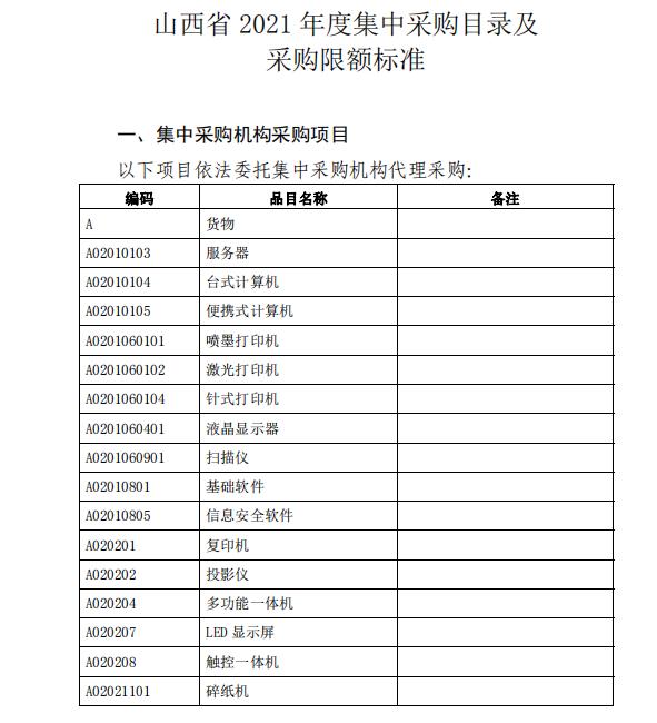 山西省2021年度集中采購目錄及采購限額標(biāo)準(zhǔn)