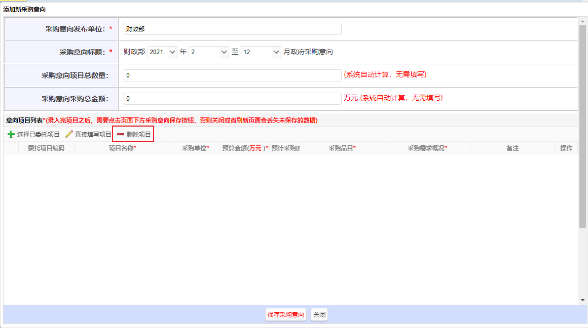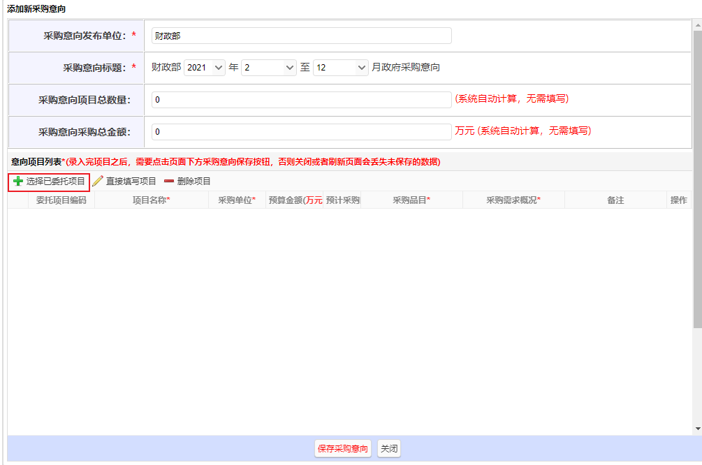 添加完項目信息后,需在【采購意向】頁面點擊下方“保存采購意向”按鈕,請勿關閉或刷新頁面,否則數(shù)據(jù)將會丟失,需重新錄入。