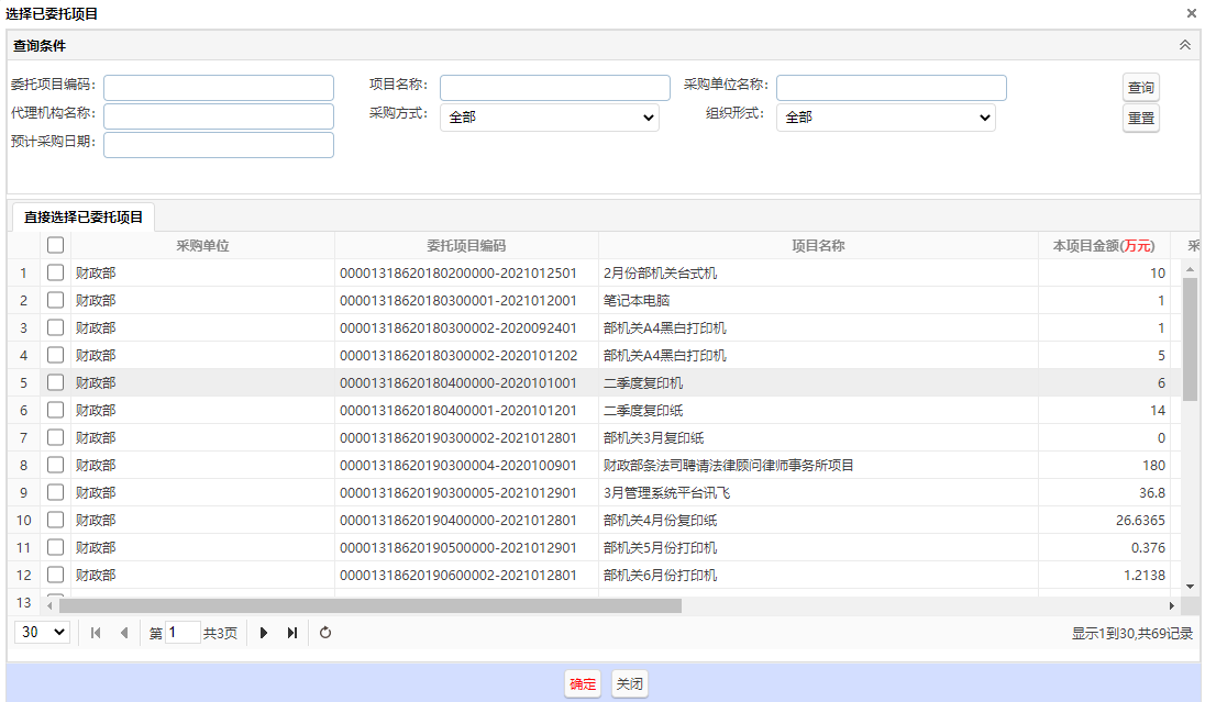 選擇已委托項目是指在采購計劃系統(tǒng)進行過委托的項目,委托之后在意向系統(tǒng)關聯(lián)選擇,系統(tǒng)將帶出部分信息。