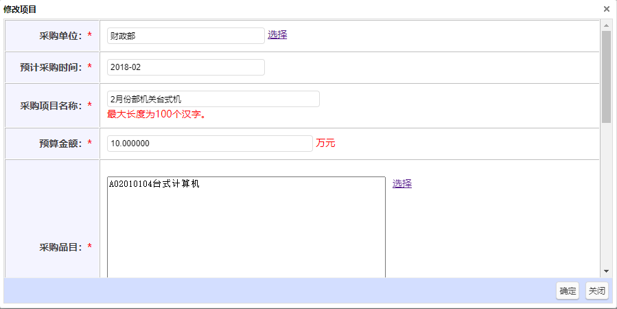添加項目頁面如圖,頁面包含采購單位、預計采購時間、采購項目名稱、預算金額、采購品目、采購需求概況,備注,除備注之外其余都為必填項。
