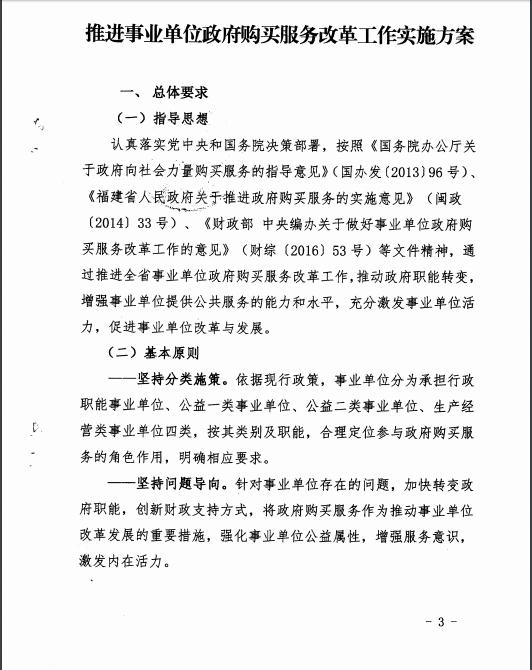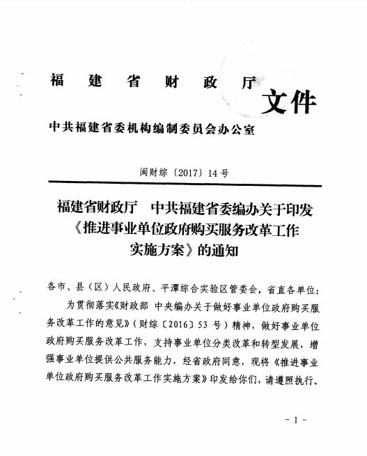 為做好事業單位政府購買服務改革工作,支持事業單位分類改革和轉型發展,增強事業單位提供公共服務能力,現將《福建省財政廳 中共福建省委編辦關于<印發推進事業單位政府購買服務改革工作實施方案>的通知》(閩財綜[2017]14號)轉發給你們,請遵照執行。