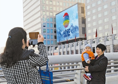 APEC會(huì)標(biāo)成為北京新的城市景觀。圖為市民在奧林匹克公園附近的LED巨屏播放的APEC會(huì)標(biāo)前拍照留念。