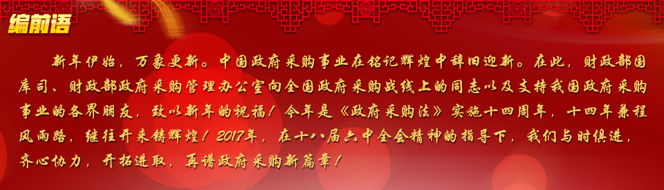 2016年是“十三五”的開局之年,政府采購圍繞貫徹落實黨的十八屆三中、四中、五中、六中全會精神,按照全國政府采購工作會議提出的深化政府采購制度改革的總體要求,針對中央巡視提出的政府采購有關問題,以全面落實巡視整改工作為契機,繼續推動政府采購制度改革向縱深發展?!?a href="http://www.ibu8w.cn/specialtopic/2017yd/zttt/201612/t20161226_7788947.htm">全文】