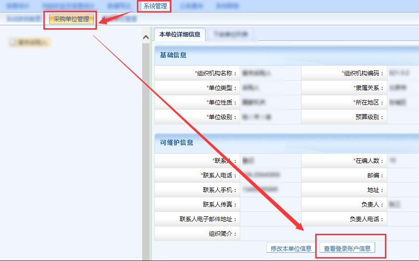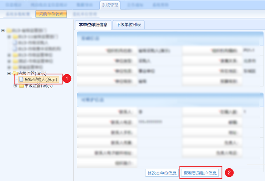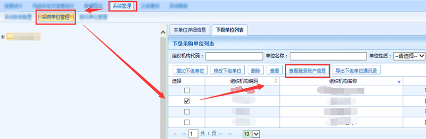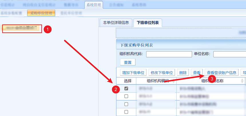 方法一,在左側組織樹找到下級單位并選中,然后點擊查看登錄賬戶信息。