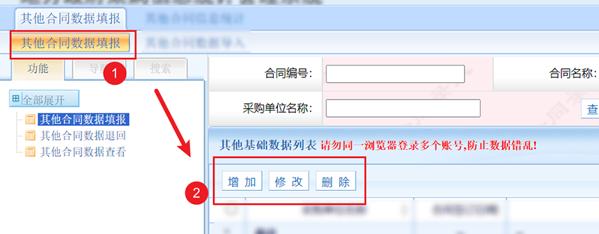 第二步,點擊其他合同數據填報進行數據錄入,由于其他合同只在年末錄入,所以填報時不用選擇數據期間,錄入頁面類似普通合同(其他合同不用錄入合同編號與合同名稱)。