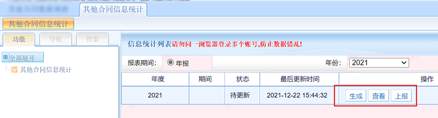 第三步,點擊其他合同信息統計生成報表(其他合同只有年報,沒有季報),生成完成,檢查數據無誤后,點擊上報按鈕上報數據。