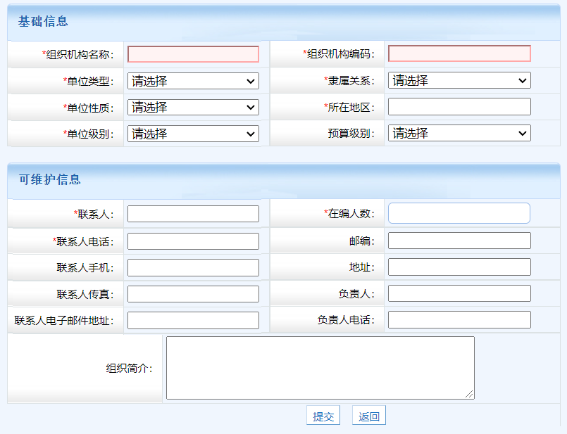 第二步,錄入下級單位信息,其中組織機構編碼在系統中唯一,其中單位類型、單位性質、單位級別影響系統功能和報表統計,請謹慎選擇。