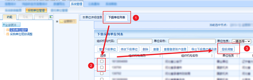首先,在下級單位列表選擇要遷移的下級單位,然后點擊層級調整。
